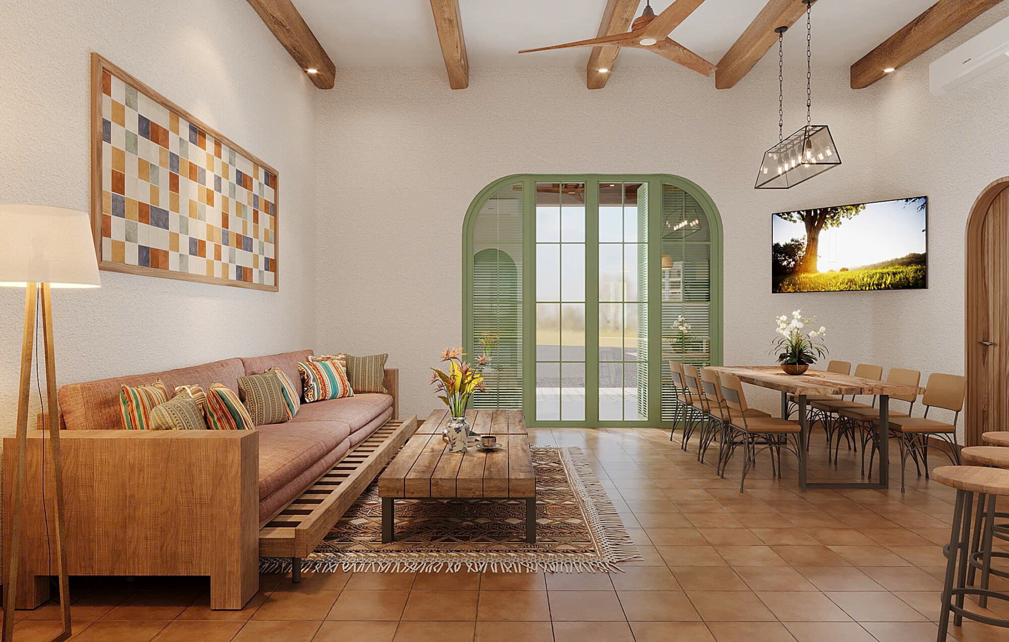 Homestay tại Hội An mang đậm nét kiến trúc Địa Trung Hải pha chút hoài cổ, phù hợp với không gian văn hóa phố Hội. Gam màu trắng – xanh pastel kết hợp mái ngói đỏ tạo cảm giác tươi sáng, ấm áp và gần gũi. Hệ cửa vòm và ban công hoa phủ xanh giúp không gian luôn thông thoáng, đón nắng gió tự nhiên. Bố cục công năng được thiết kế khoa học, tối ưu cho việc lưu trú – nghỉ dưỡng: tầng trệt dành cho khu sinh hoạt chung, tầng trên bố trí phòng nghỉ riêng tư cùng sân thượng mở hướng ra cảnh quan. Một không gian dung hòa giữa truyền thống và tiện nghi hiện đại.